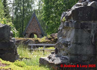 de Skogs kyrkoruin/Church ruin . Er is een kleine parking , dan nog 250 m tot aan een prachtig domein . Hier bevindt zich